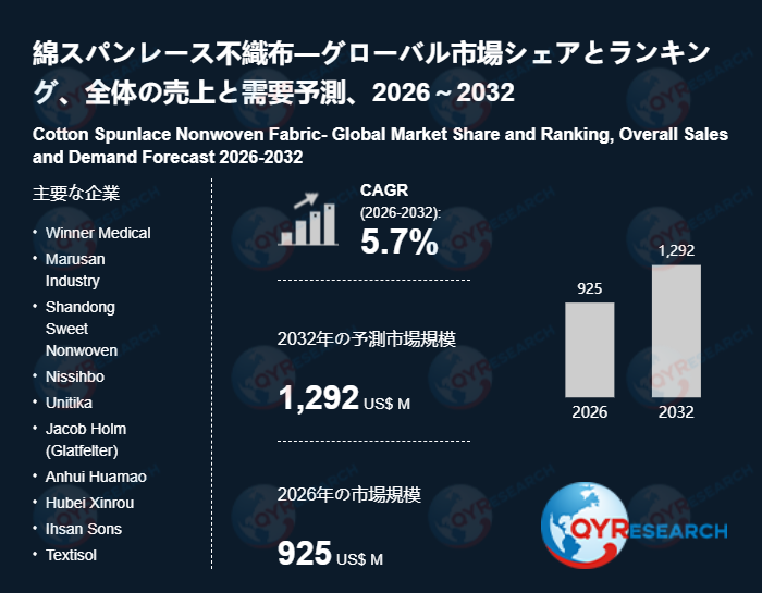 QYResearchが発表した新たな市場調査レポート「綿スパンレース不織布―グローバル市場シェアとランキング、全体の売上と需要予測、2026~2032」によると、世界の綿スパンレース不織布市場規模は2025年の約879百万米ドルから2026年の925百万米ドルへと順調に拡大すると見込まれ、予測期間中は年平均成長率(CAGR)5.7%で成長し、2032年には1292百万米ドルに達すると予測されている。